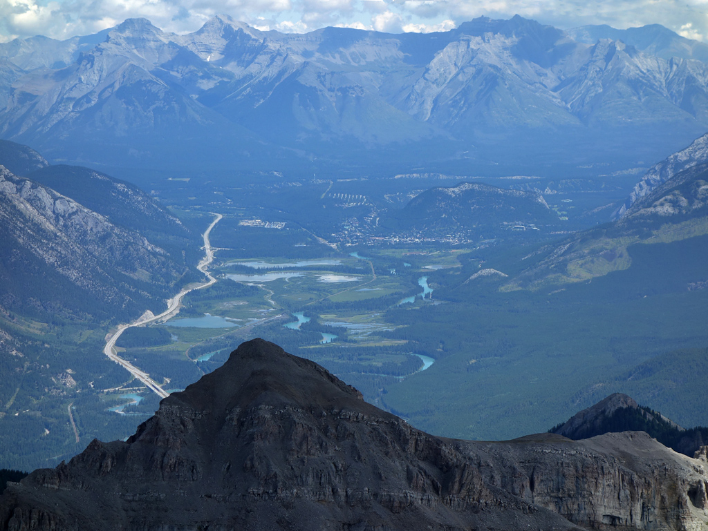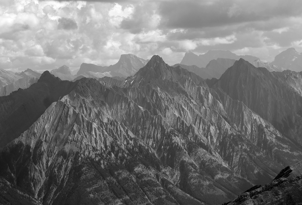 Unfortunately for me, the clear weather in the morning soon gave way to rolling dark clouds in the early afternoon, which obscured Assiniboine and made lighting conditions tricky. I waited for an hour on the summit for things to clear, a period made all the more pleasant by a friendly group from the Calgary Outdoor Club, but alas that wouldn't happen until I was already descending from Harvey Pass to the valley below.