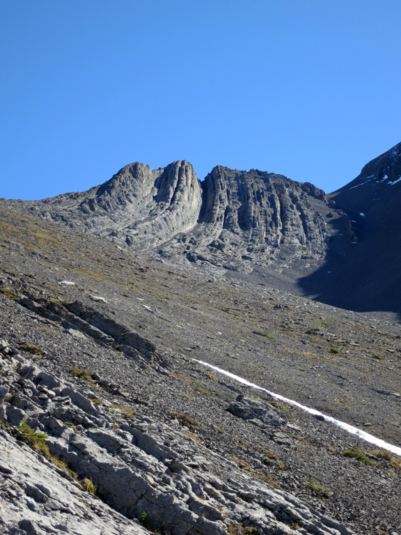 Once you're ready to depart the summit, simply retrace your steps to the shoulder of the first false summit where I recommend bypass down as the treadmill scree makes for a fast and enjoyable descent. It's around here where you can decide to continue to follow your ascent route through the first cliff bands, or take an alternative descent route as described under considerations.