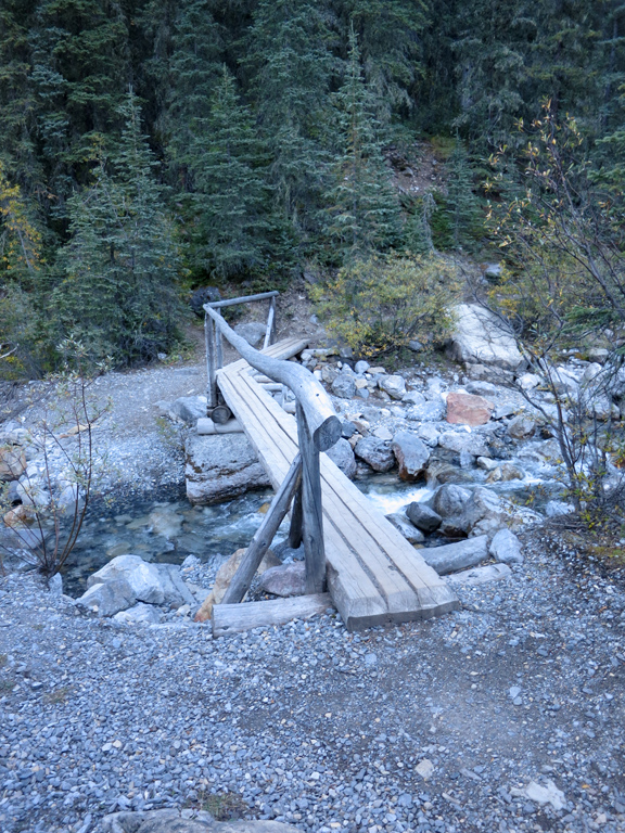 This trail will eventually lead you to the old hot spring pools (now an abandoned building), which you can detour around to left (east) to reach a well-maintained hiking trail (for the Sulphur Skyline) which continues south along the creek. At around the 1.3 km mark you will reach a footbridge that crosses the creek and leads the trail uphill through the forest. This is where you will leave the trail.